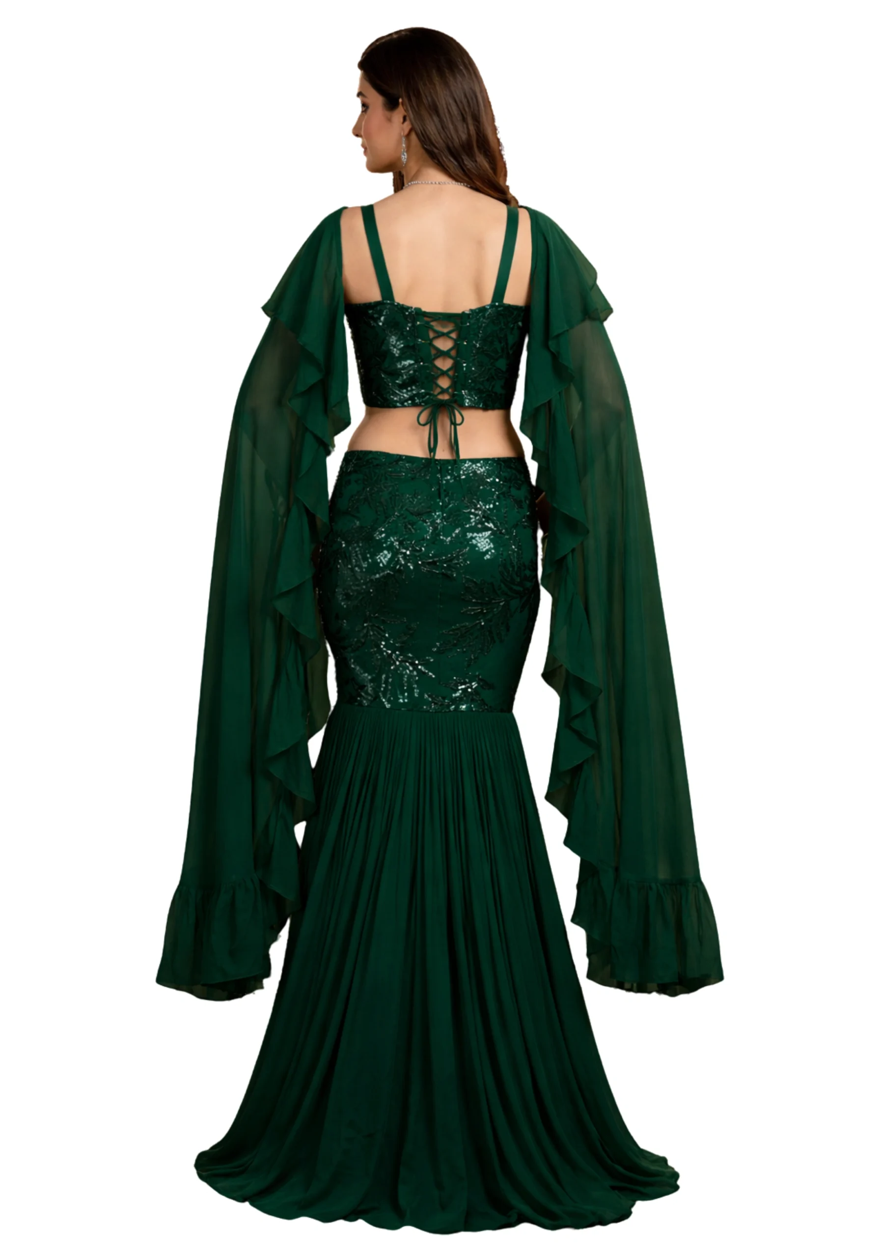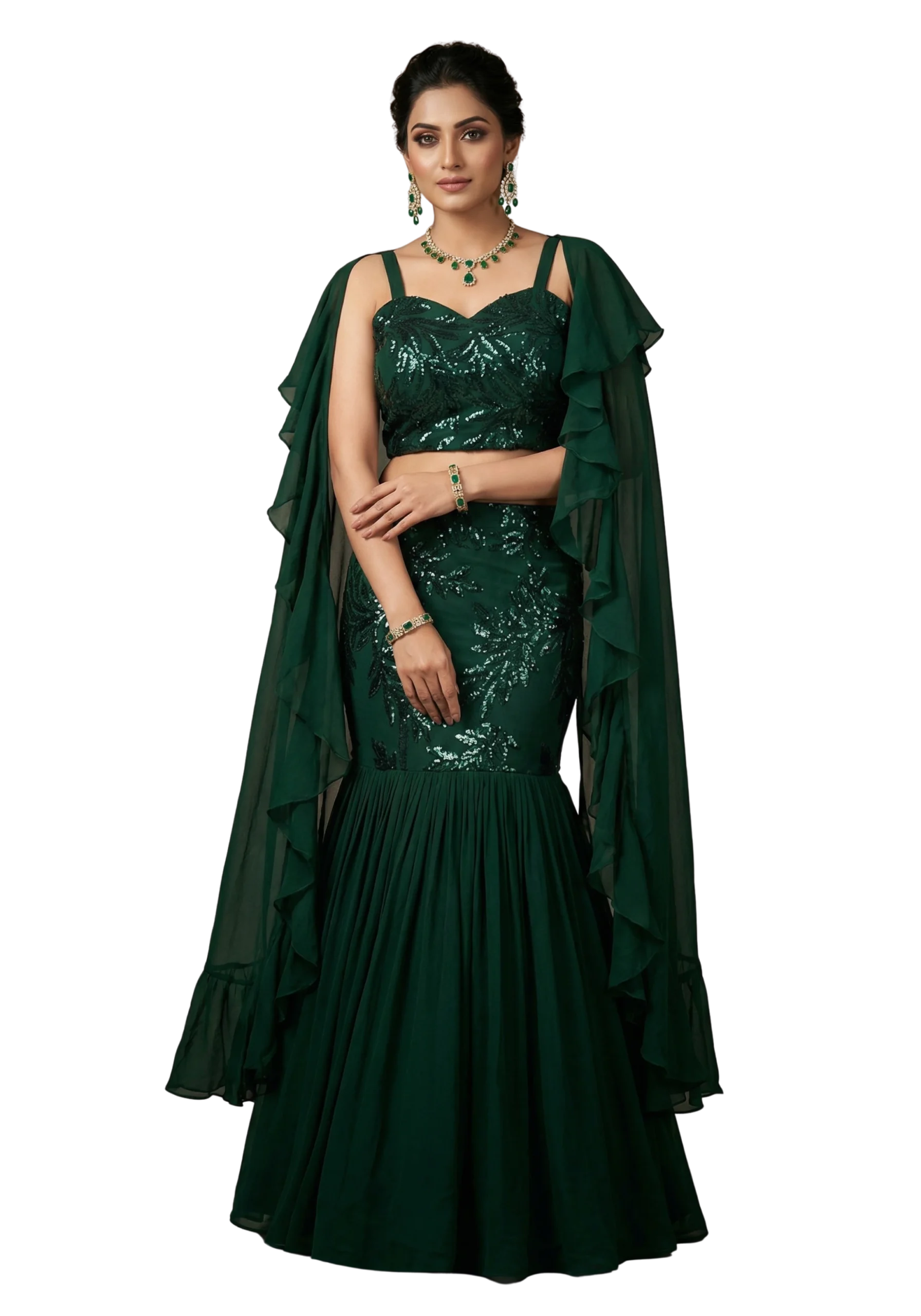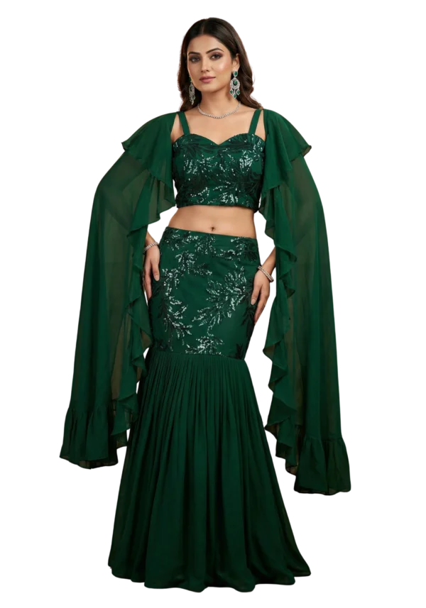 Turn heads at every celebration with this elegant Green Fish Cut Crop Top Set with Dupatta. Designed in premium sequin net fabric, this outfit gives a glamorous shine while remaining lightweight and comfortable for summer occasions.